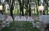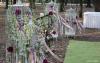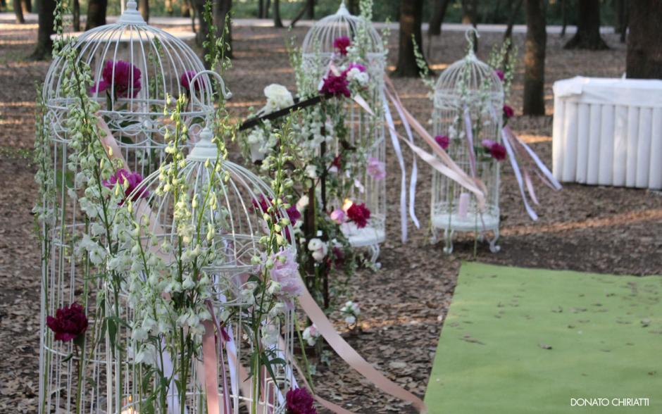 Gabbie come colombaie, corsie d'erba inglese e lampade floreali in un bosco di betulle.