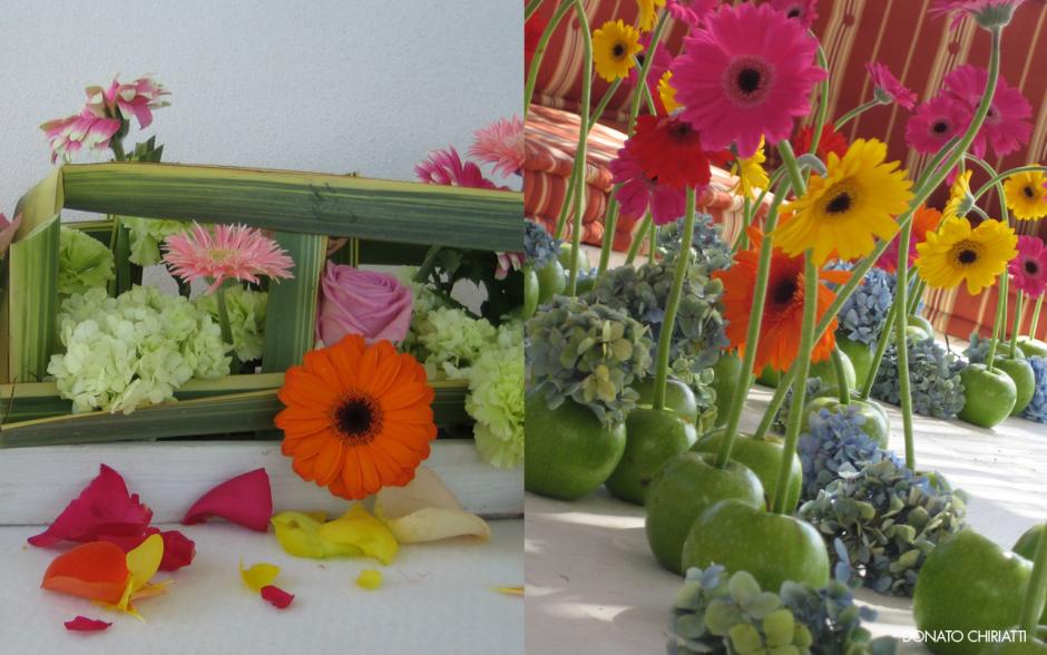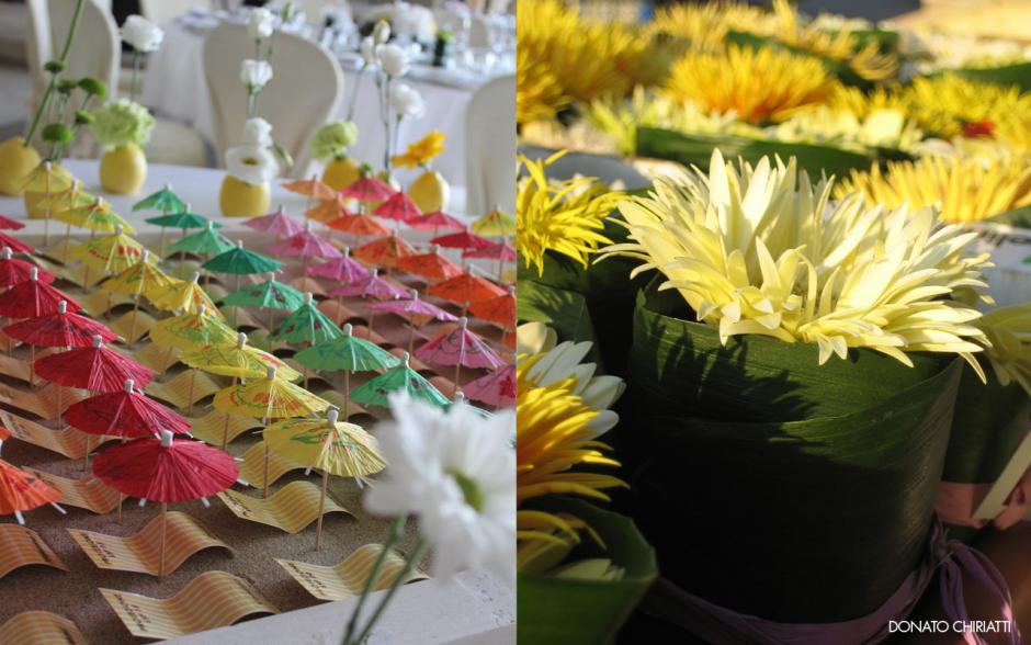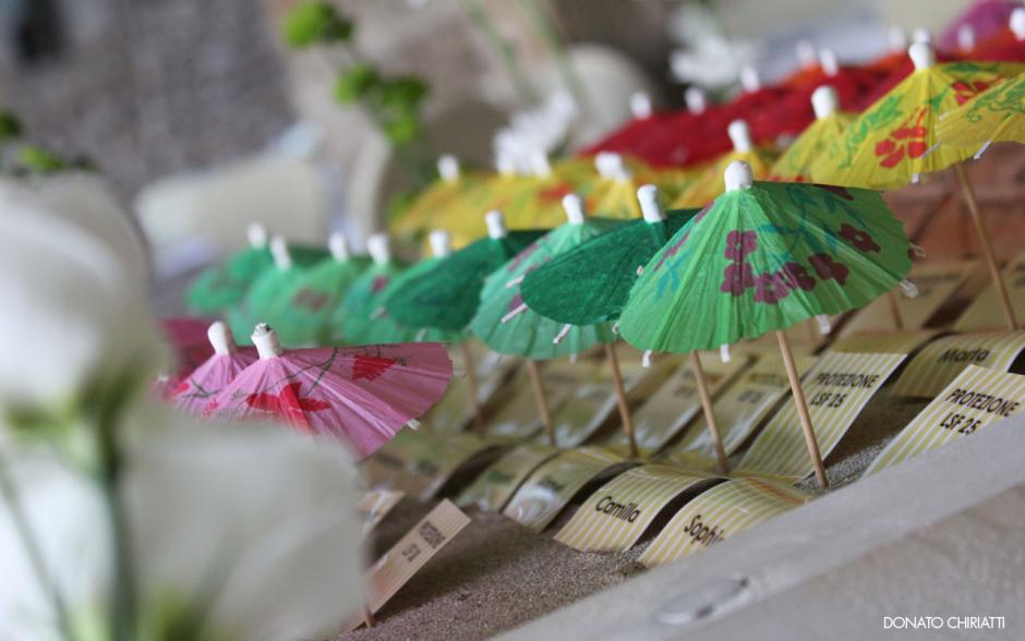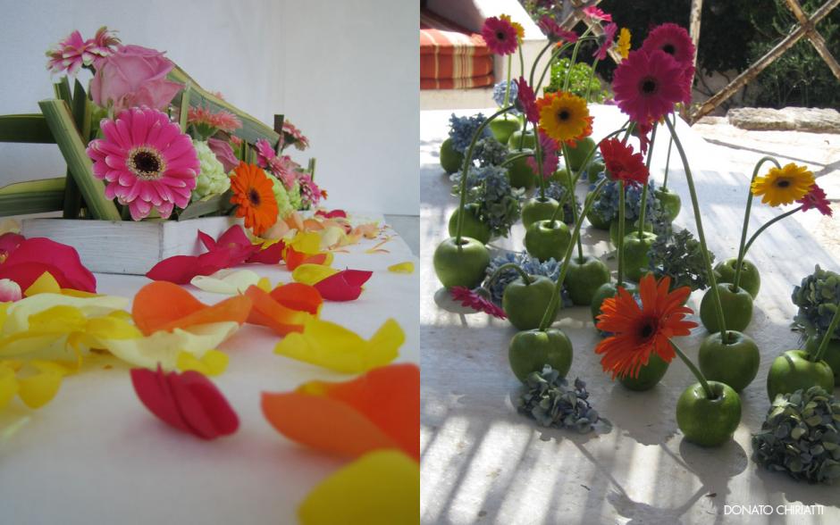 Ombrellini come tableau, mele come vasi per fiori e colori come tema a Borgo Egnazia di Fasano.